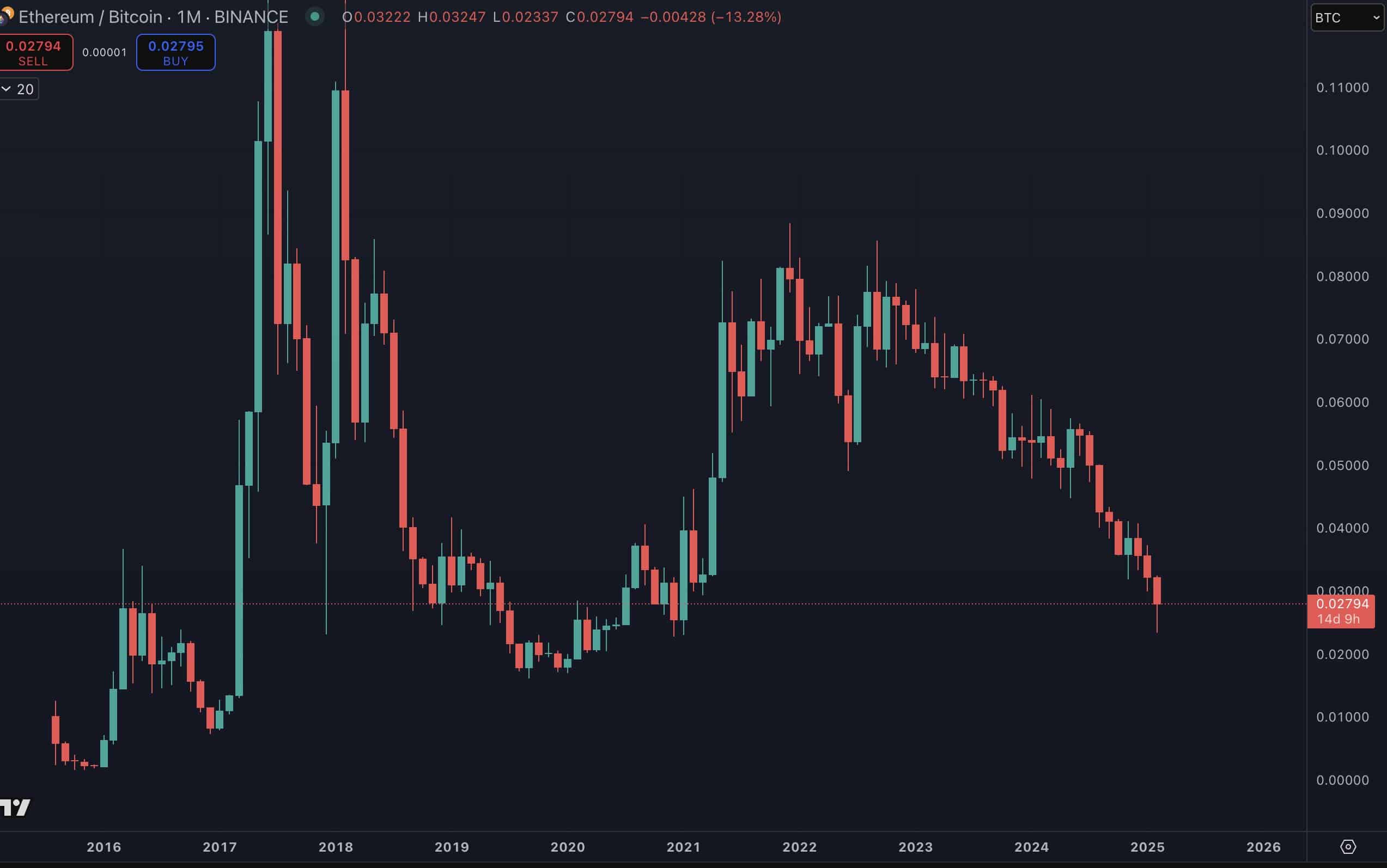 The latest ETH/BTC monthly chart underlined a sharp decline, with the pair breaking below key historical support levels. Trading at 0.0279 at press time, ETH/BTC dropped by 13.28% this month, extending its multi-year downtrend that began in late 2021.