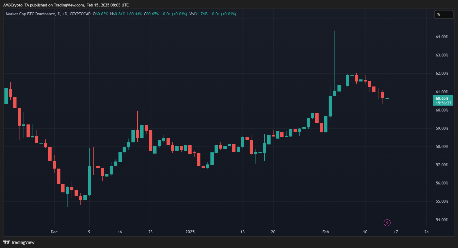 Bitcoin dominance [BTC.D] has been on an upward trajectory lately, with the same reaching 60.65% and reinforcing its stronghold over the crypto market.
