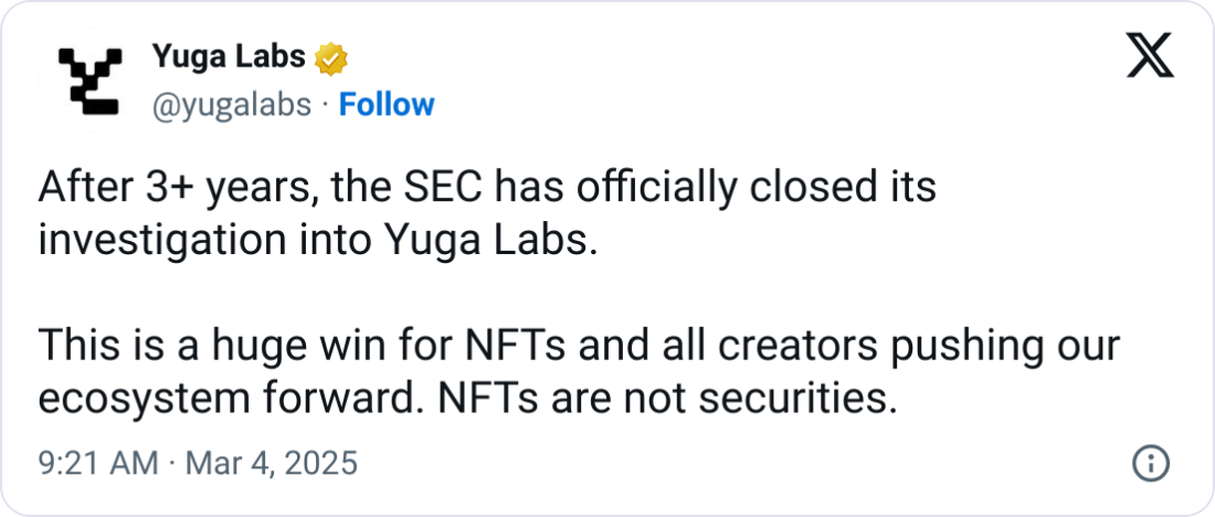 At the start of March, the US Securities and Exchange Commission closed its three-year investigation into Yuga Labs, an investigation initiated under former Chair Gary Gensler, which aimed to probe NFT creators and marketplaces, to see if some NFTs, such as fractional NFTs, were securities.