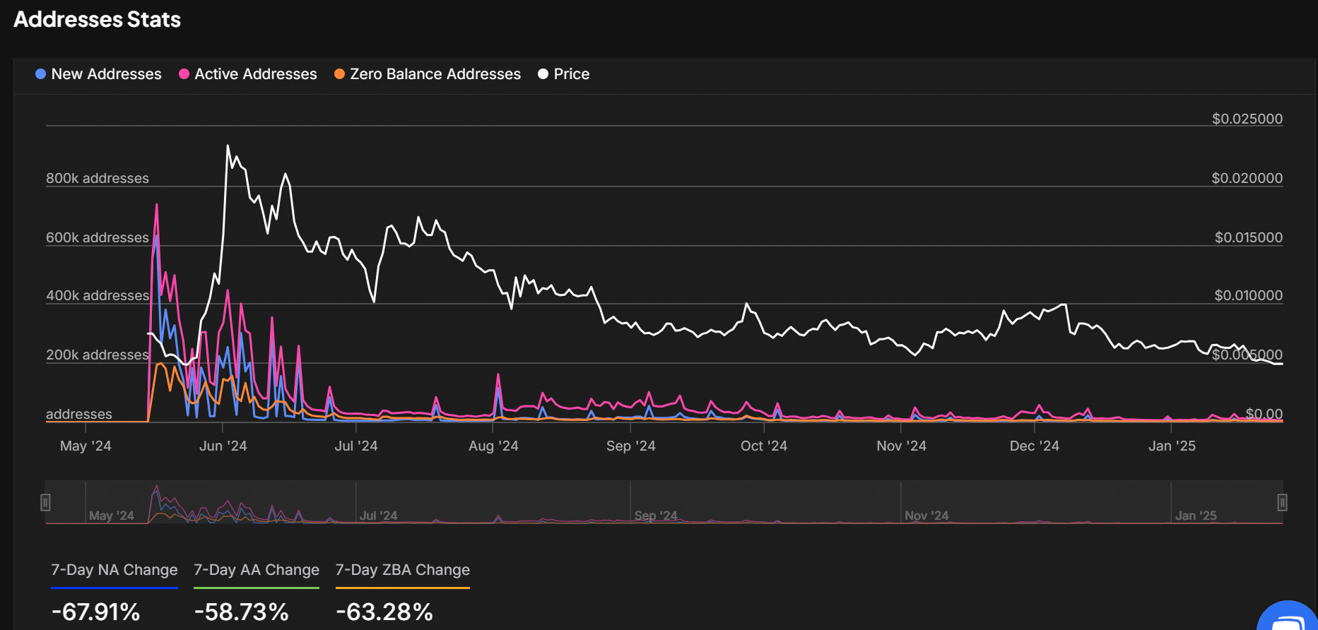 Furthermore, zero-balance addresses have fallen by 63.28%, showing fewer transactions being initiated. These figures reveal a lack of interest from retail participants, which could significantly slow any recovery.