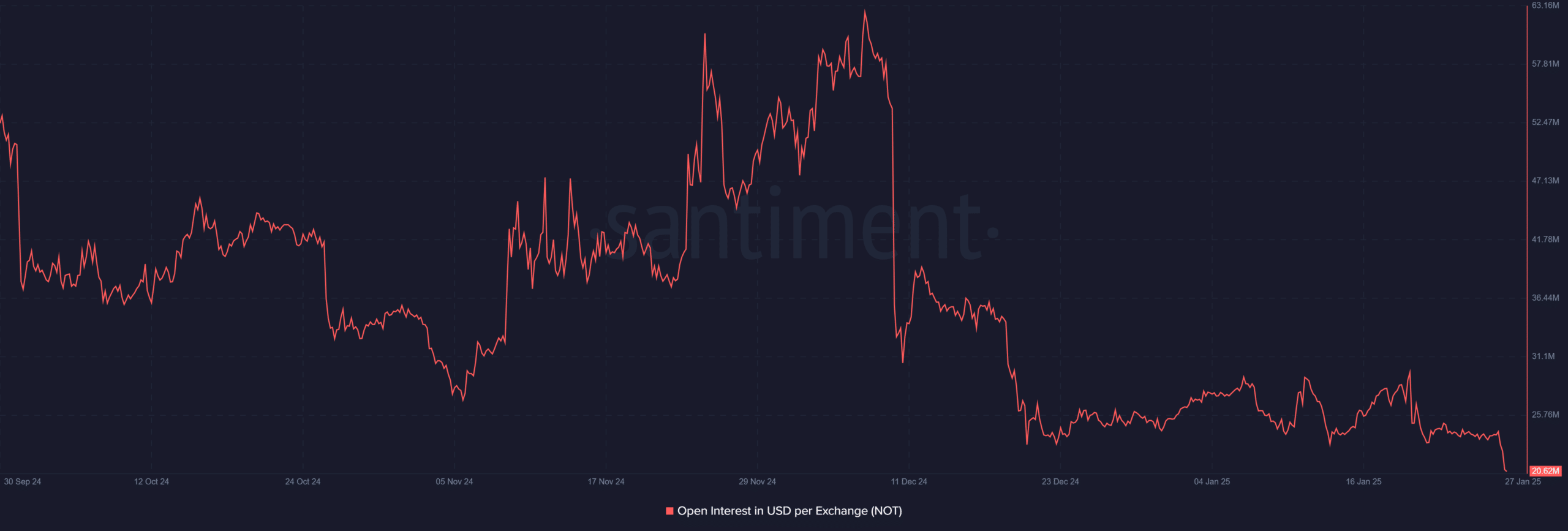 Open interest in USD across exchanges for NOT has fallen sharply to $20.62 million, underscoring a lack of speculative activity.