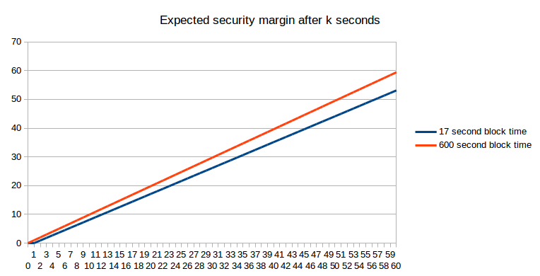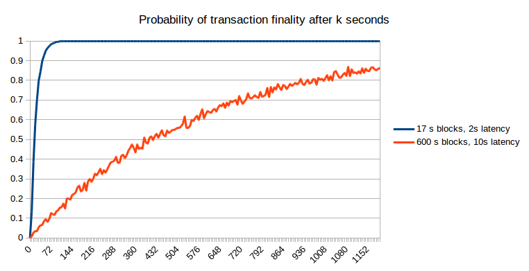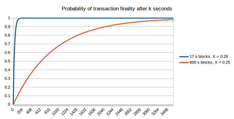 Note that for fast block times, we do have to make an adjustment because the stale rates are higher, and we do this in the above graph: we set X = 0.25 for the 600s blockchain and X = 0.28 for the 17s blockchain. Hence, the faster blockchain does allow the probability of non-reversion to reach 1 much faster. One other argument that may be raised is that the reduced cost of attacking a blockchain for a short amount of time over a long amount of time means that attacks against fast blockchains may happen more frequently; however, this only slightly mitigates fast blockchains’ advantage. For example, if attacks happen 10x more often, then this means that we need to be comfortable with, for example, a 99.99% probability of non-reversion, if before we were comfortable with a 99.9% probability of non-reversion. However, the probability of non-reversion approaches 1 exponentially, and so only a small number of extra confirmations (to be precise, around two to five) on the faster chain is required to bridge the gap; hence, the 17-second blockchain will likely require ten confirmations (~three minutes) to achieve a similar degree of security under this probabilistic model to six confirmations (~one hour) on the ten-minute blockchain.