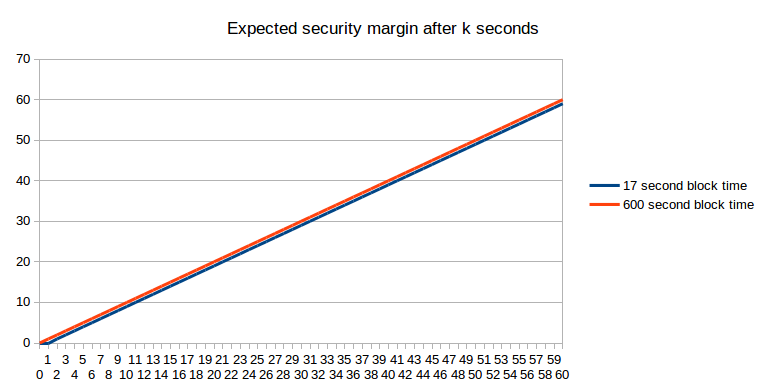 We can also approach the subject of attackers from the other side: the attacker has $X to spend, and can spend it on bribes, near-infinite instantaneous hashpower, or anything else. How high is the requisite X to revert a transaction after k seconds? Essentially, this question is equivalent to “how much economic expenditure does it take to revert the number of blocks that will have been produced on top of a transaction after k seconds”. From an expected-value point of view, the answer is simple (assuming a block reward of 1 coin per second in both cases):