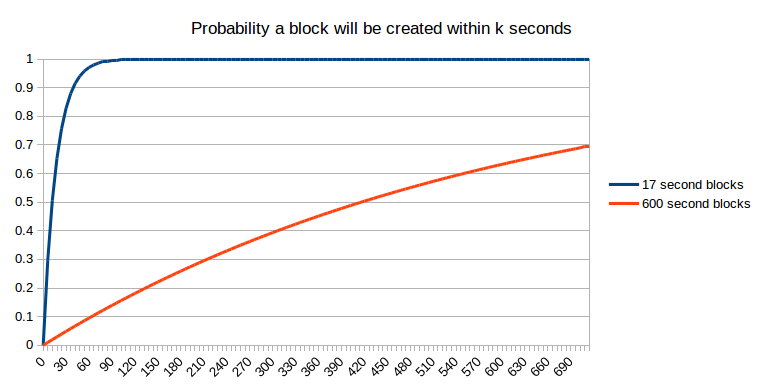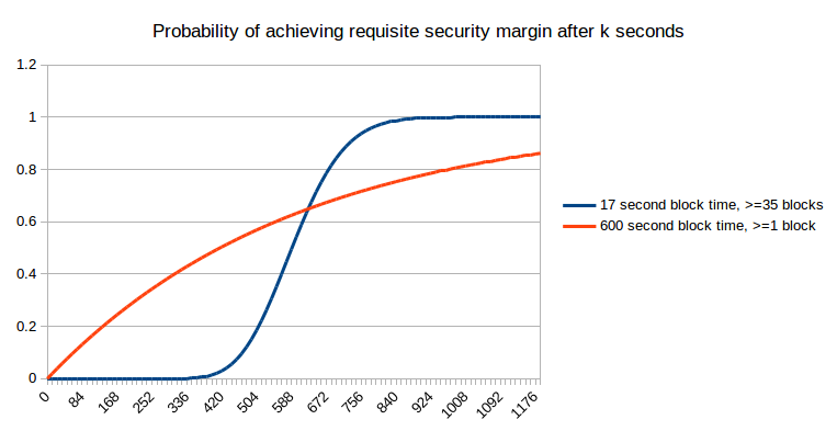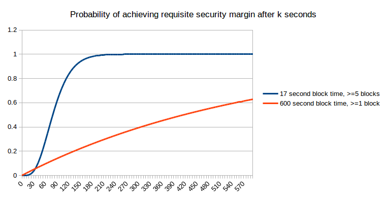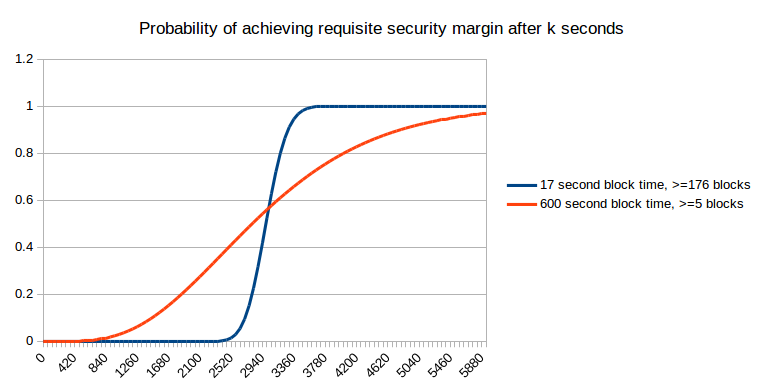 But “what is the expected economic security margin after k seconds” (using “expected” here in the formal probability-theoretic sense where it roughly means “average”) is actually not the question that most people are asking. Instead, the problem that concerns ordinary users is arguably one of them wanting to get “enough” security margin, and wanting to get there as quickly as possible. For example, if I am using the blockchain to purchase a $2 coffee, then a security margin of $0.03 (the current bitcoin transaction fee, which an attacker would need to outbid in a replace-by-fee model) is clearly not enough, but a security margin of $5 is clearly enough (ie. very few attacks would happen that spend $5 to steal $2 from you), and a security margin of $50000 is not much better. Now, let us take this strict binary enough/not-enough model and apply it to a case where the payment is so small that one block reward on the faster blockchain is greater than the cost. The probability that we will have “enough” security margin after a given number of seconds is exactly equivalent to a chart that we already saw earlier: