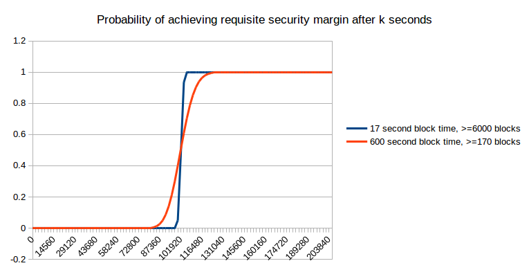 Here, we can see that fast blocks no longer provide an unambiguous benefit; in the short term they actually hurt your chances of getting more security, though that is compensated by better performance in the long term. However, what they do provide is more predictability; rather than a long exponential curve of possible times at which you will get enough security, with fast blocks it is pretty much certain that you will get what you need within 7 to 14 minutes. Now, let us keep increasing the desired security margin further:
