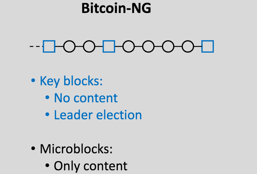 A recent interesting proposal presented at the Scaling Bitcoin conference in Montreal is the idea of splitting blocks into two types: (i) infrequent (eg. 10 minute heartbeat) “key blocks” which select the “leader” that creates the next blocks that contain transactions, and (ii) frequent (eg. 10 second heartbeat) “microblocks” which contain transactions: