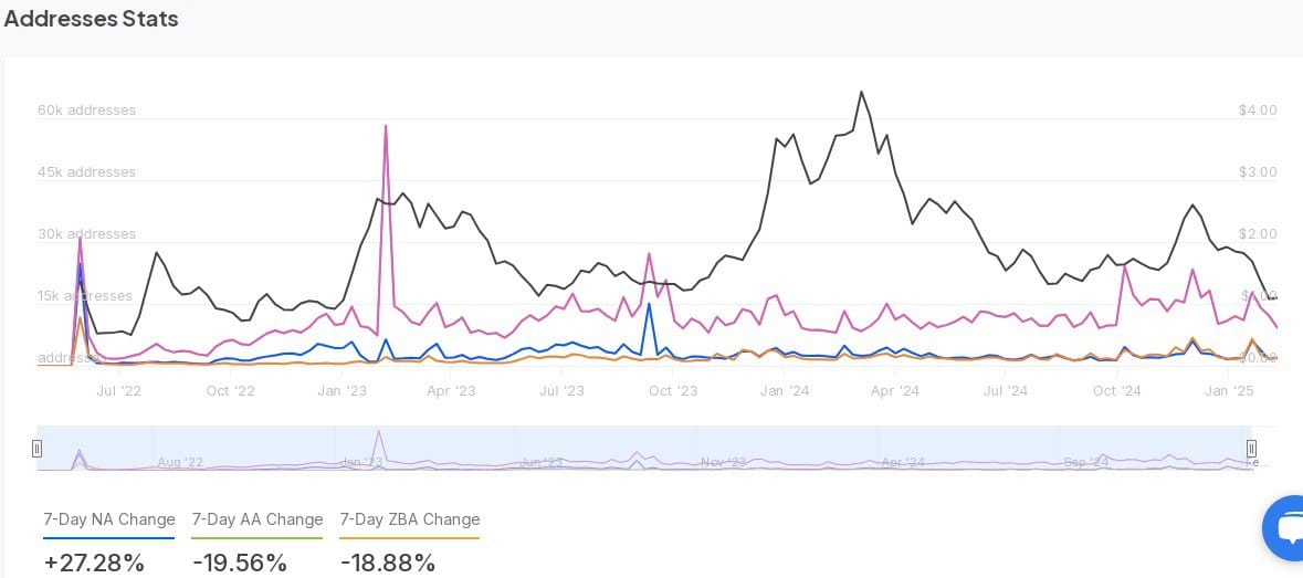However, the number of Active Addresses (AA) declined by 19.56%, suggesting that fewer users are engaging in transactions.