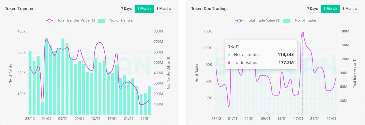 PENGU’s transfers peaked in early January with over 350,000K, while the total transfer value reached its highest at $700 million.