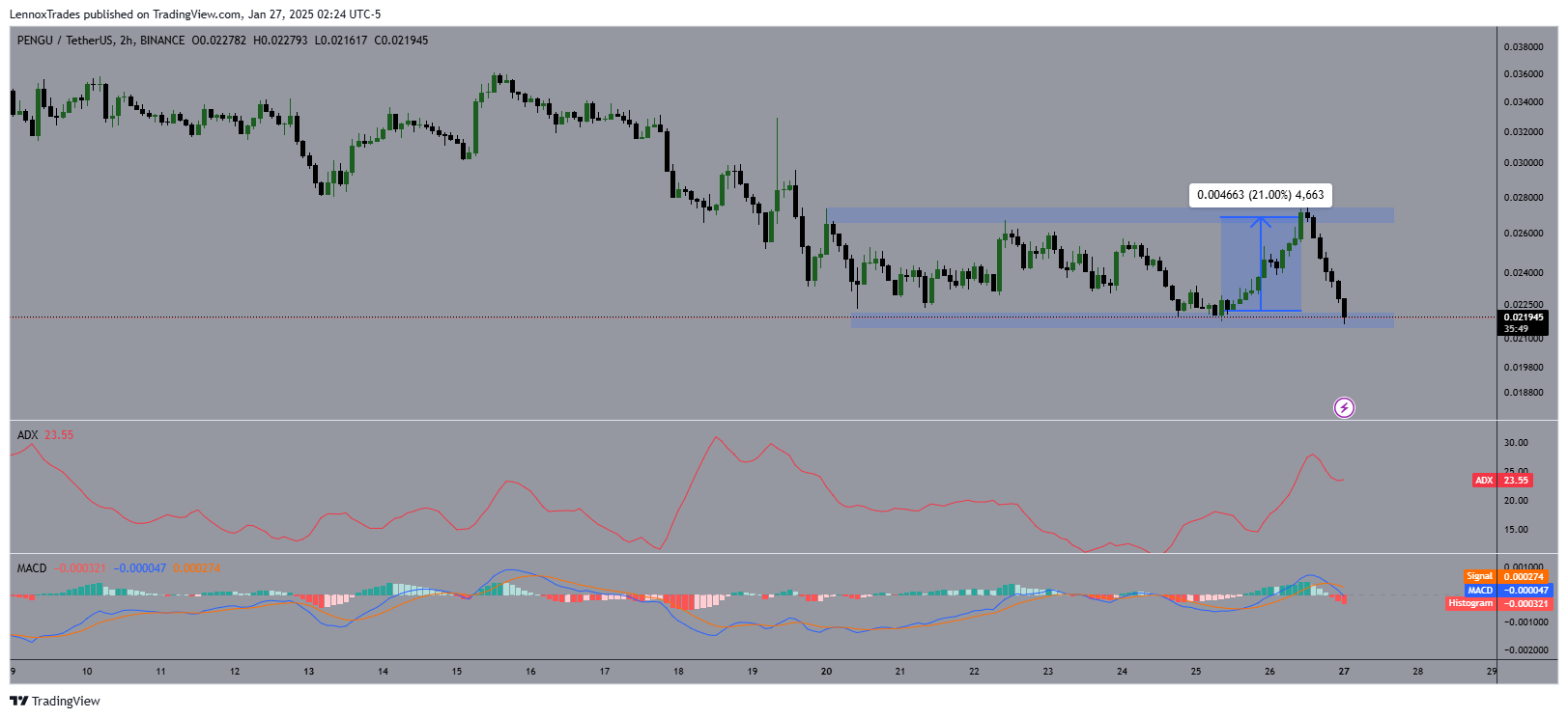 The ADX indicator, at 23.55 at press time, suggested a moderate strength in PENGU trend, supporting the notion of a solid upward move rather than a weak, volatile spike.