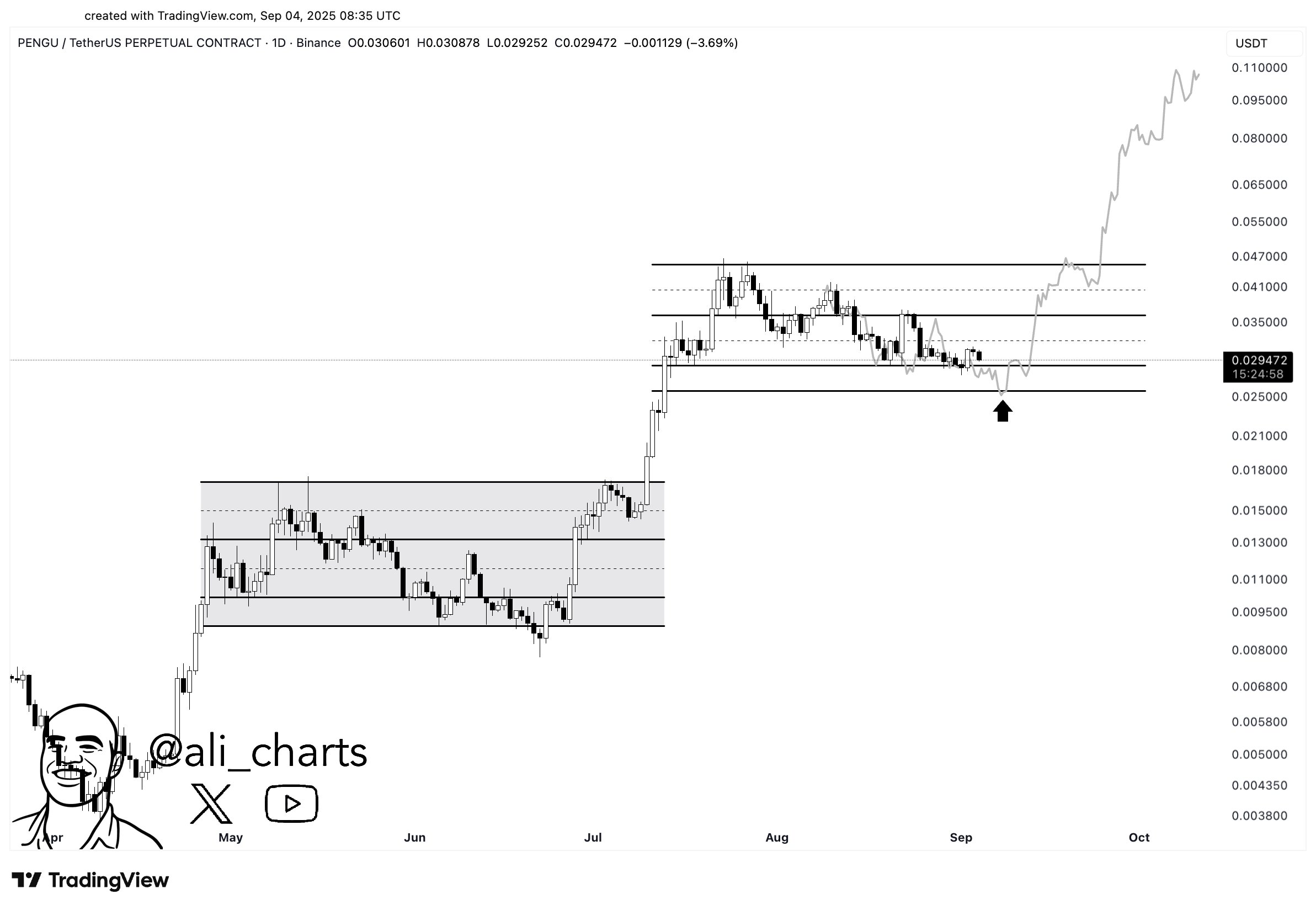 PENGU’s daily chart, as analyzed by Ali Martinez, indicated that the memecoin may be approaching its buy zone of $0.025. According to him, PENGU might be in a deep pullback phase, just like back in the second quarter of the year.