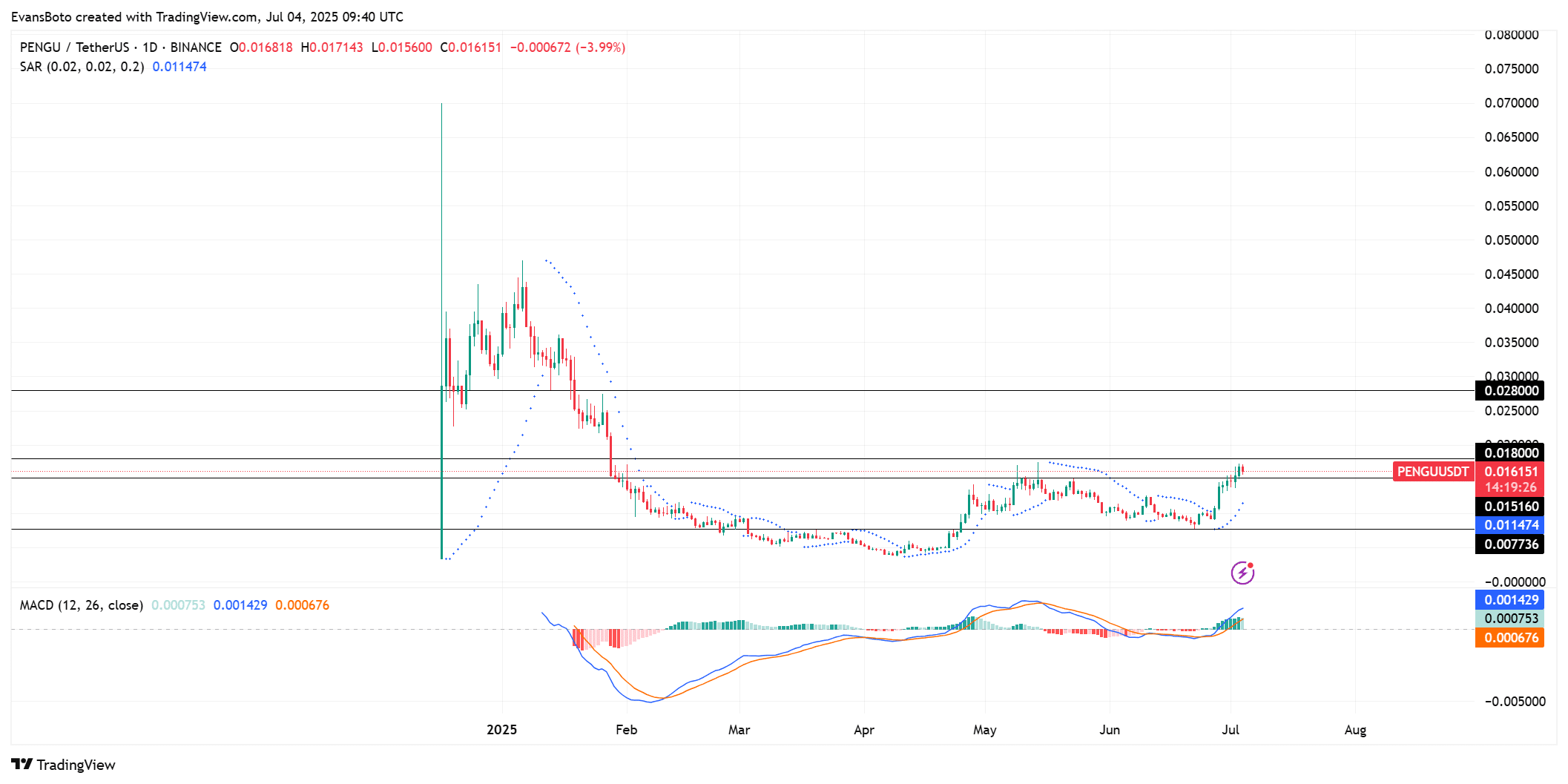 At the time of writing, PENGU traded around $0.0162, showing strong upward momentum. The question now is whether bulls can sustain this rally and trigger the next leg toward $0.028.