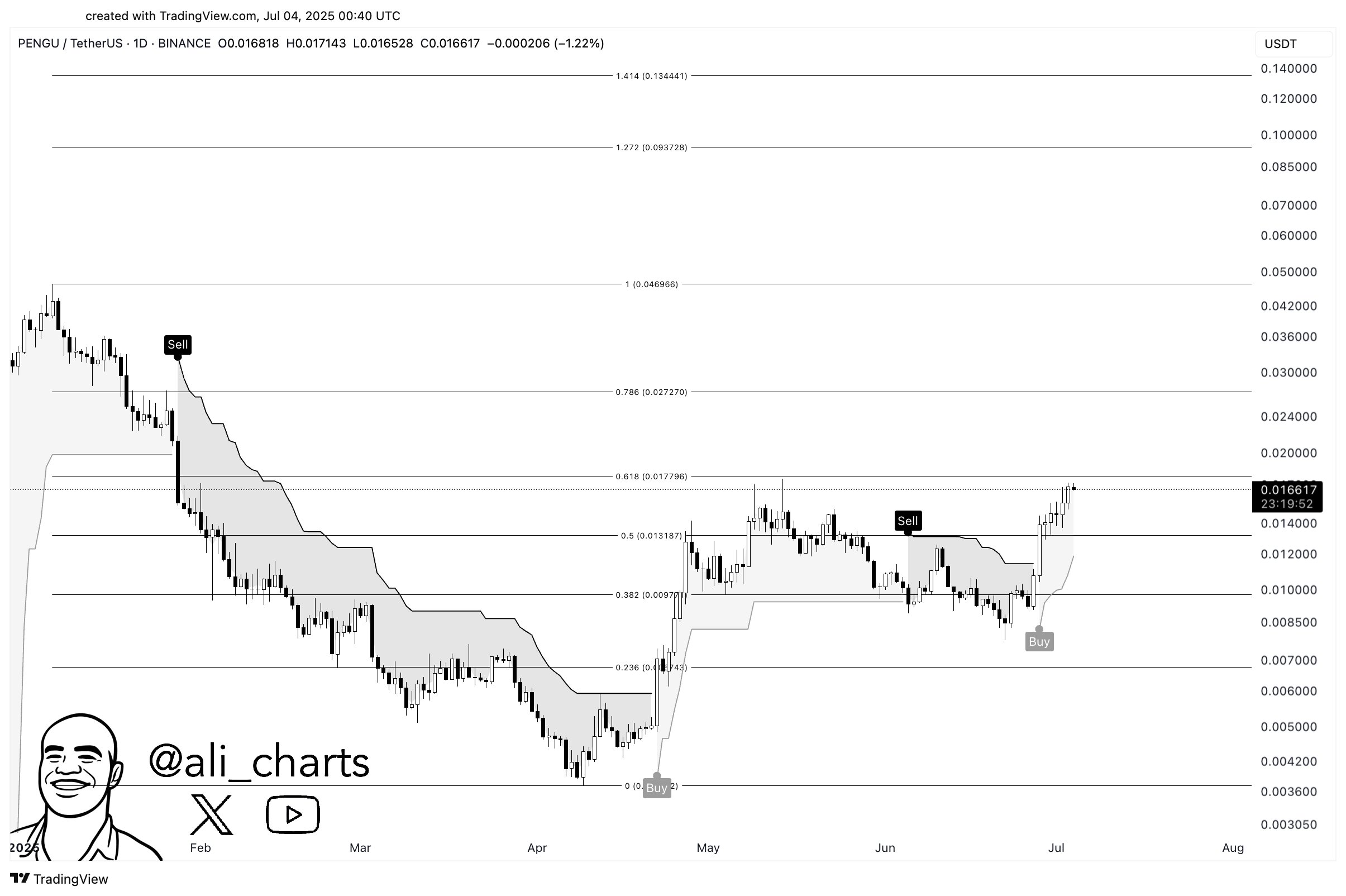 Pudgy Penguins [PENGU] has surged over 68% in the past seven days, flipping the SuperTrend indicator to a bullish signal for the first time in months.