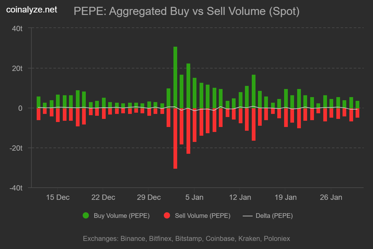 As a result, PEPE recorded a negative Buy-Sell Delta over the two days, a clear sign of aggressive spot selling. Therefore, recent whale activity poses additional downside risk to PEPE’s price charts, leading to more losses.