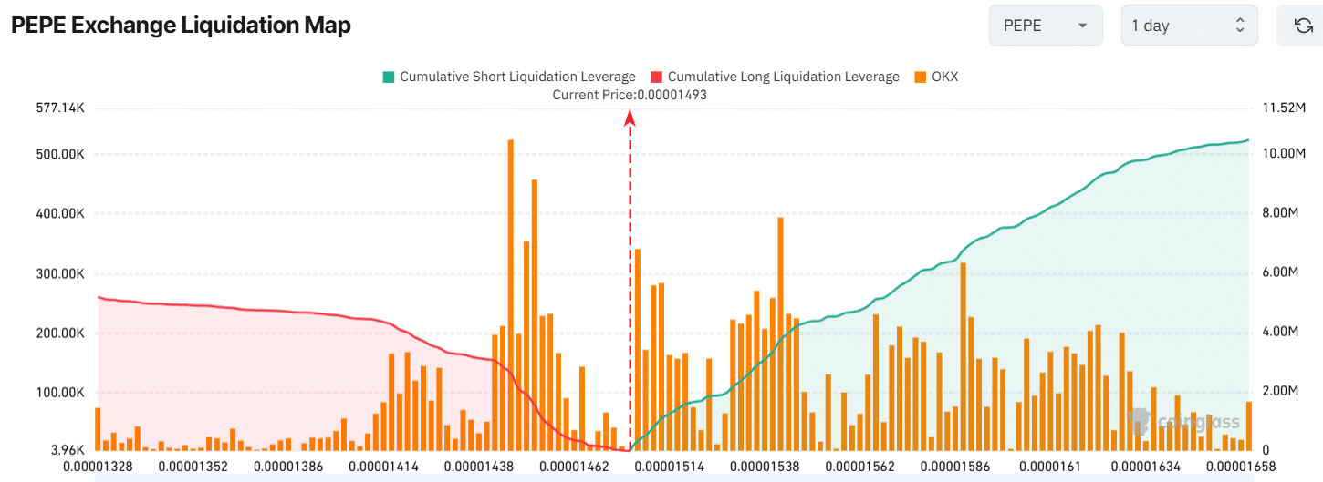 Conversely, at $0.00001542 on the upper side, sellers have built $3.73 million worth of short positions. However, these significant positions could be liquidated if PEPE’s price moves in either direction.