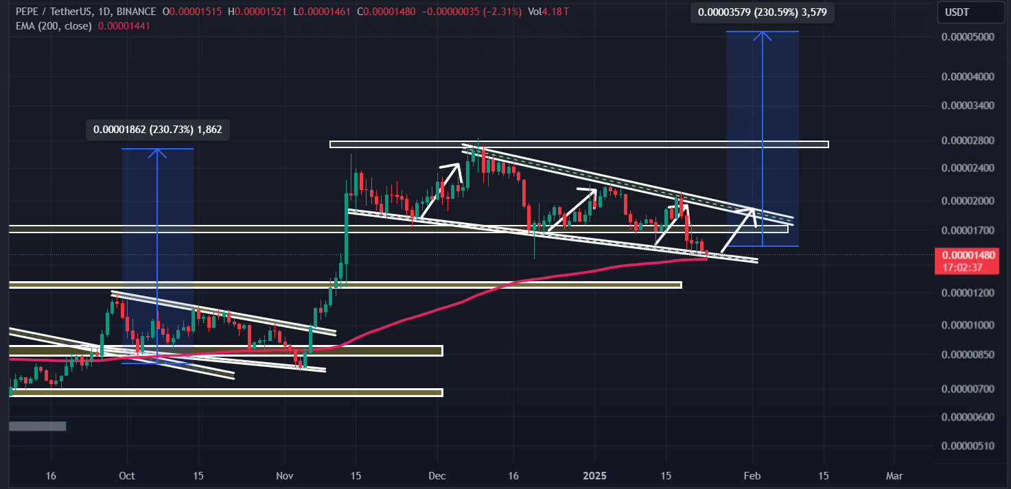 If PEPE holds this lower boundary of the falling wedge, there is a strong possibility that it could soar by 30% to reach the $0.000019 level in the coming days.