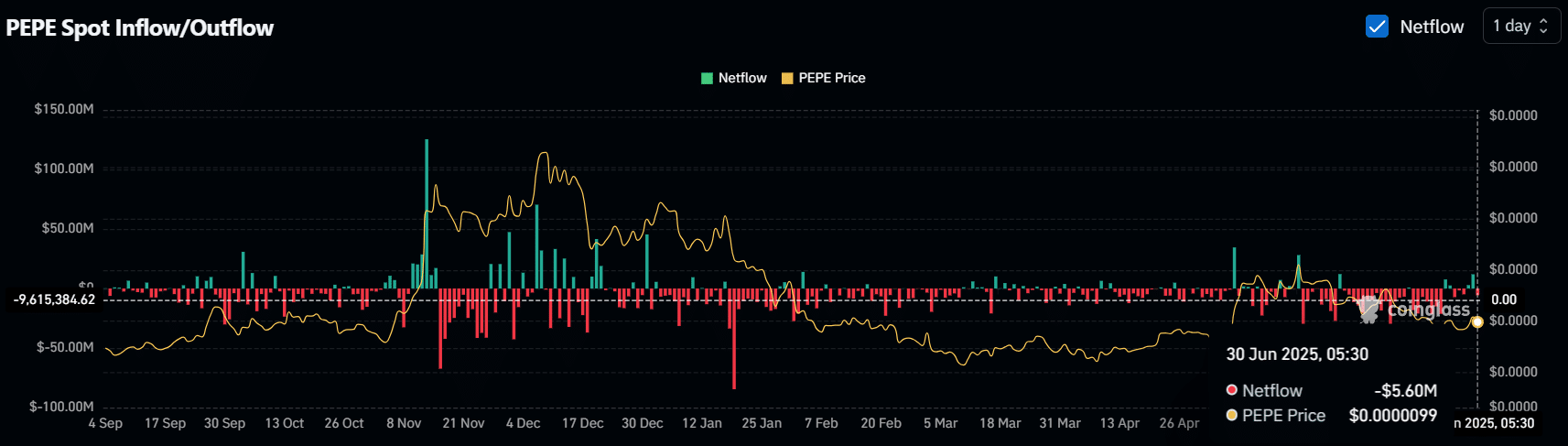 Data from the Spot inflow/outflow metric revealed that exchanges across the crypto landscape have seen outflows of $5.60 million worth of PEPE.