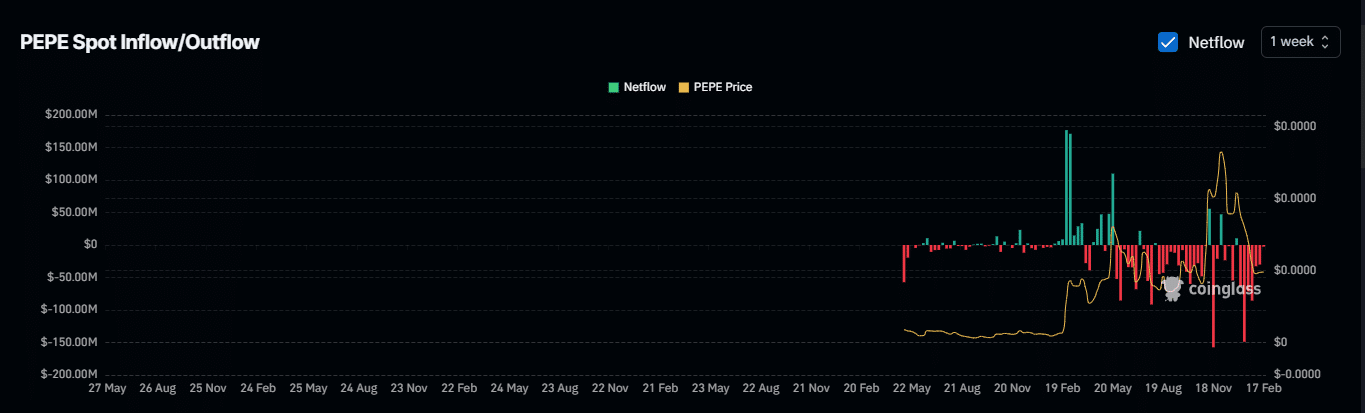 Data shows that after the OI-Weighted Funding Rate peaked at 0.0101% on the 14th of February, it has since declined to 0.0002, remaining in the negative region. This indicates there are more sellers in the market, which could impede PEPE’s potential rally.