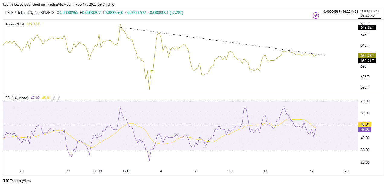 Using the Accumulation/Distribution Ratio on the chart, AMBCrypto found ongoing accumulation in the market, with a potential 635.23 trillion PEPE traded at that level.
