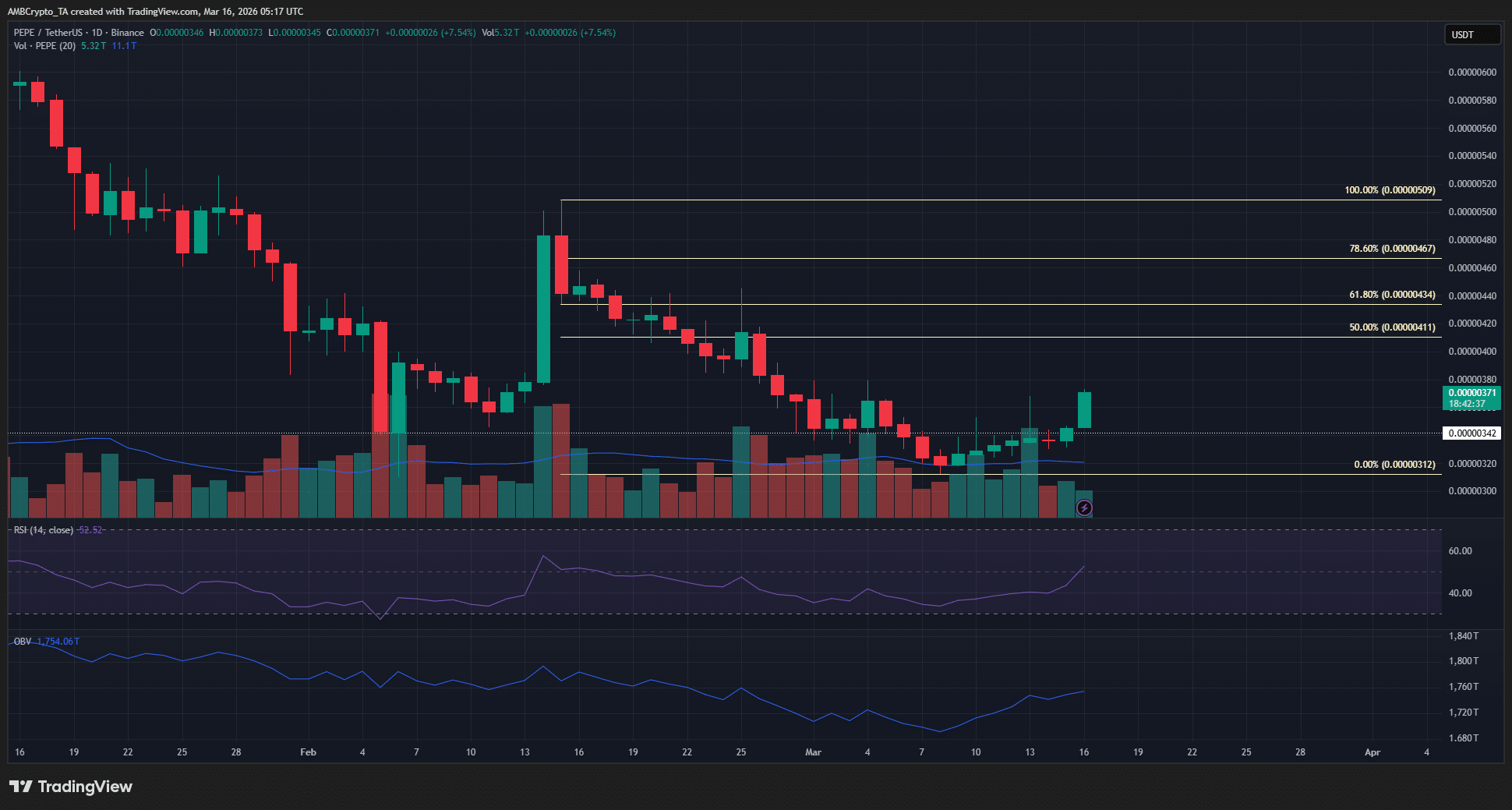 Pepe memecoin was making a remarkable recovery from its local lows and was up 16% since the previous Monday, the 9th of March.