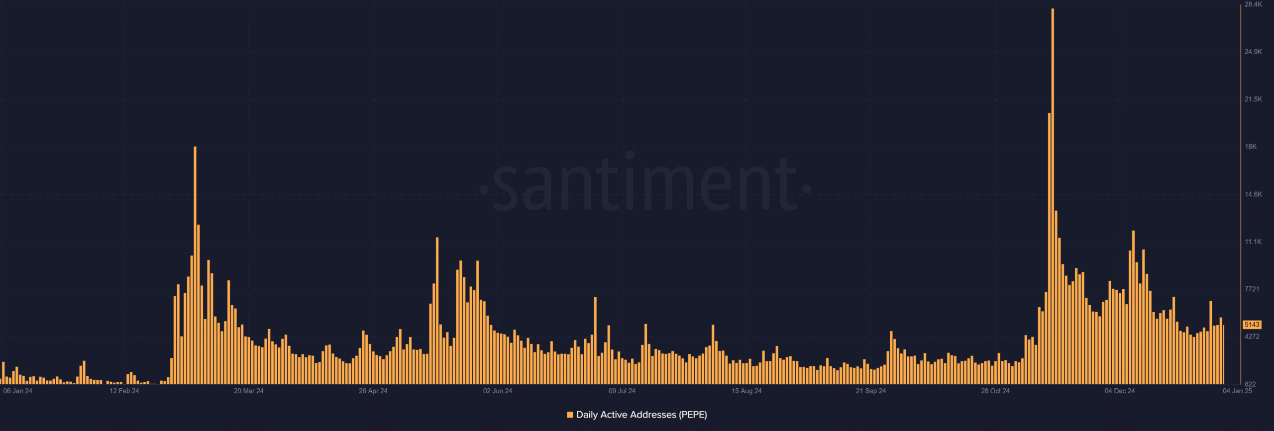 Daily active addresses were recorded at 5,143, reflecting moderate but steady participation from users. This stability indicates that a committed user base is actively engaging with Pepe, even during periods of price consolidation.