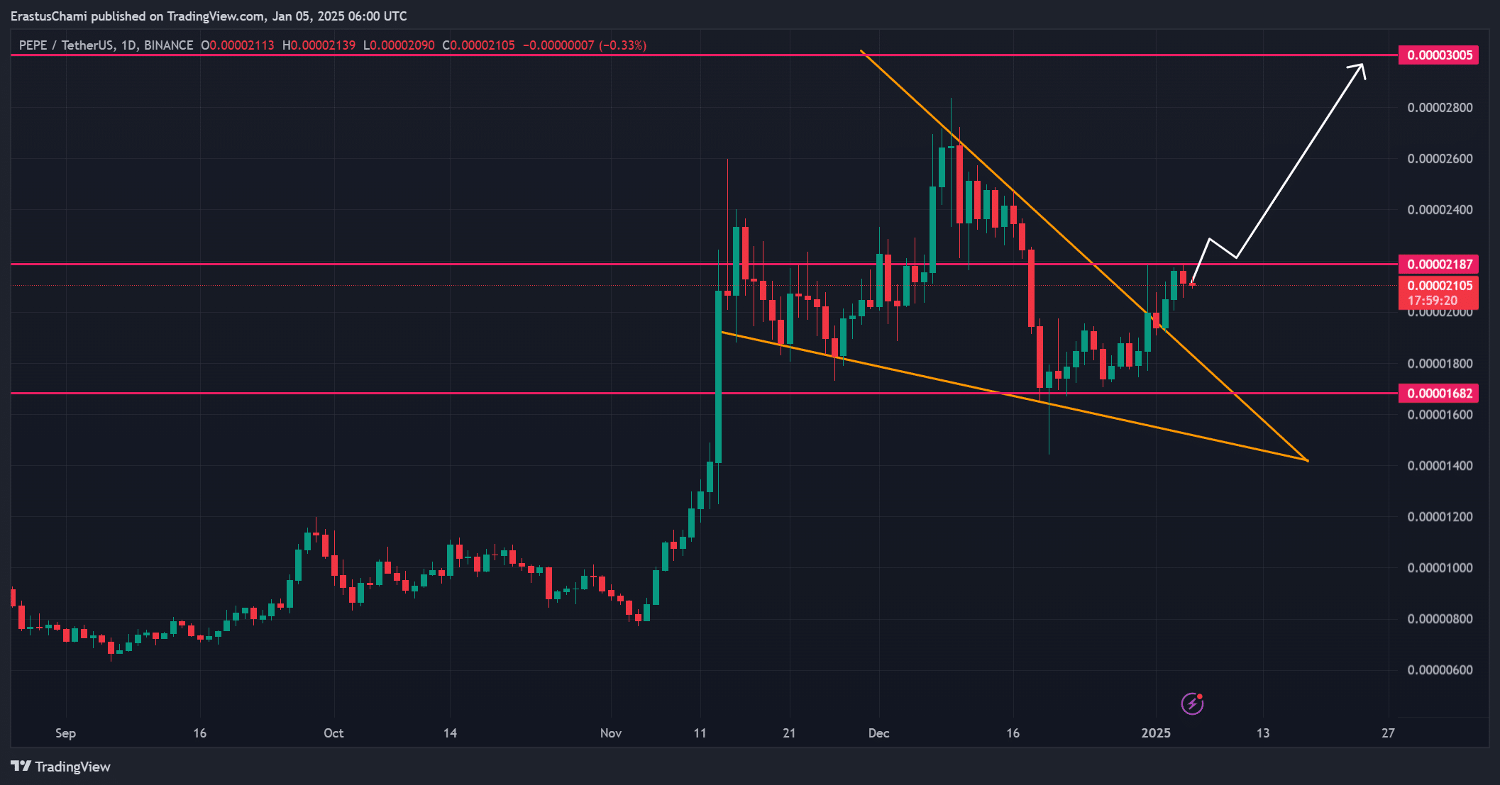 - Pepe’s breakout targets $0.00002187 resistance, with bullish patterns signaling potential upward momentum.