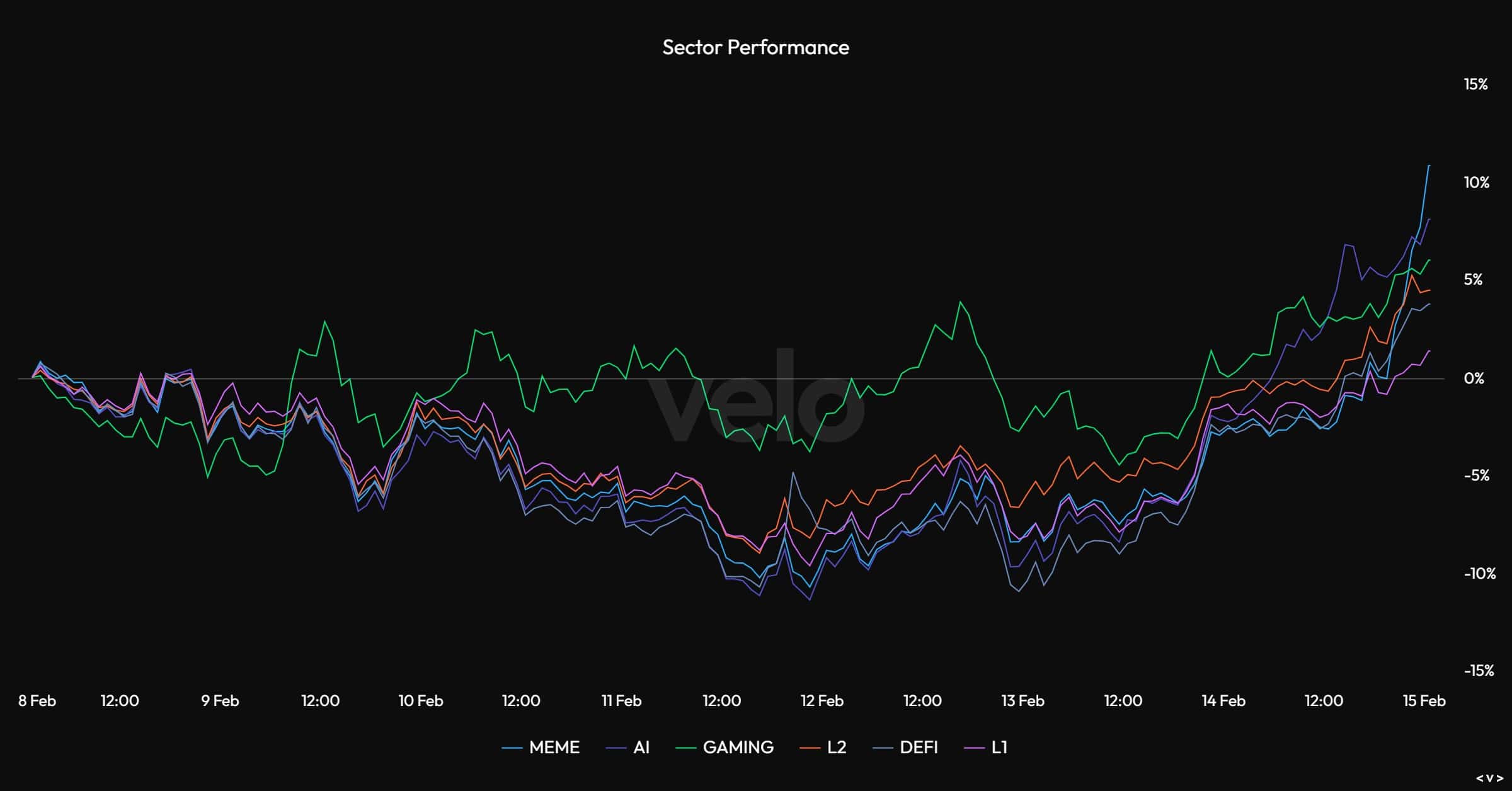 Memecoins reacted first, rallying toward +10% by February 15. Their rebound accelerated as speculative capital rotated aggressively. Social momentum and viral narratives amplified participation.