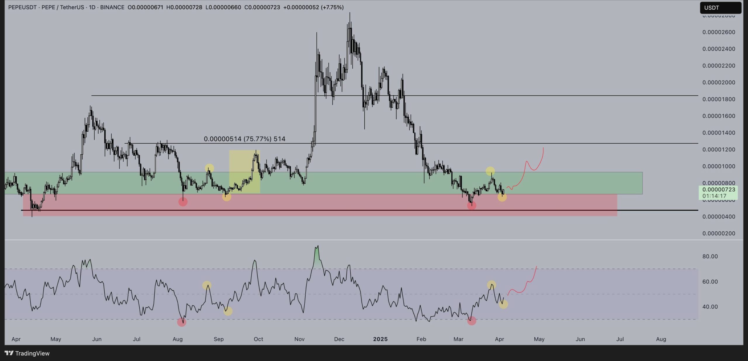 A potential bullish recovery emerged in the green mid-zone, ranging from $0.00000070 to $0.000000800, as the daily RSI hovered near the lower boundary close to 50.