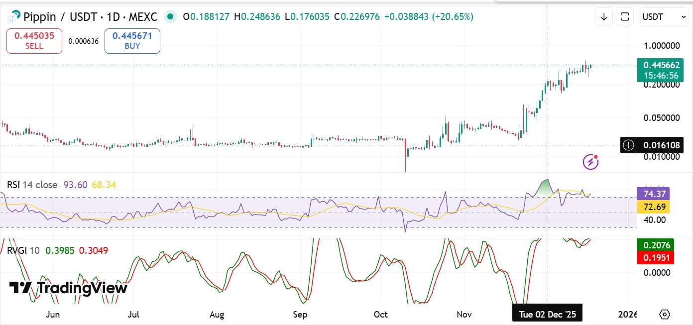 Pippin defended the $0.40 support zone and climbed 14.77% to a session high of $0.455. At press time, Pippin [PIPPIN] traded at $0.447, up 10.32% on the daily chart.