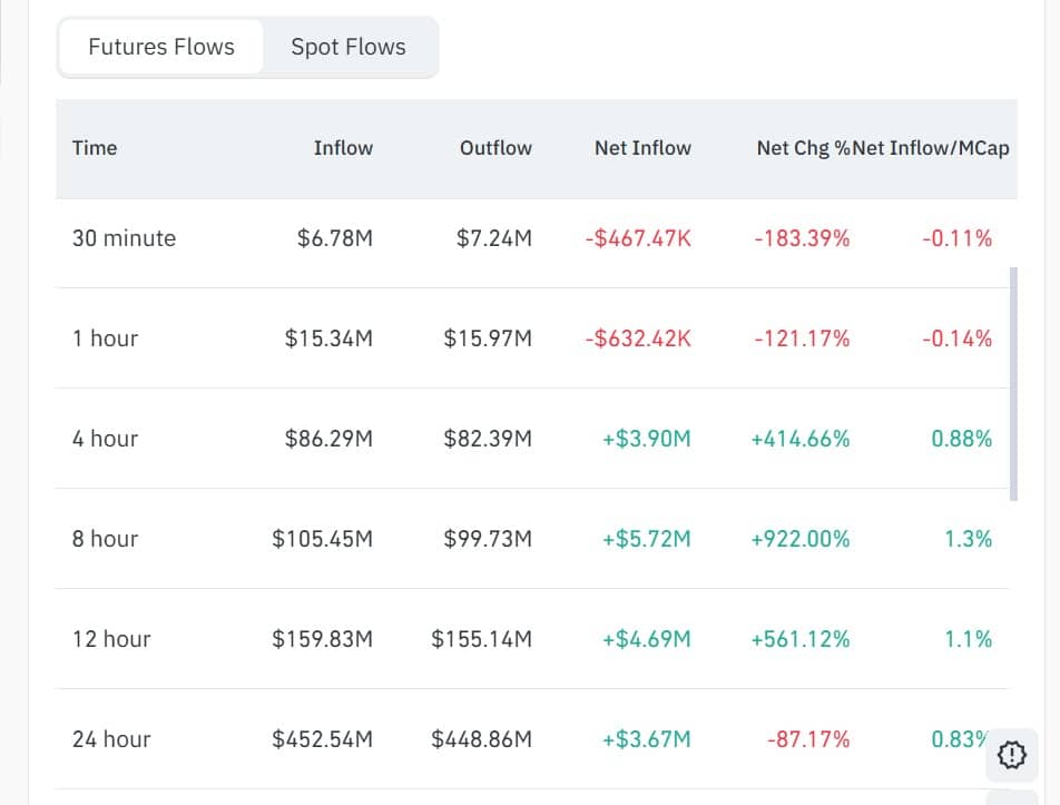 According to CoinGlass data, Futures Inflows totaled $452.54 million over the past 24 hours. Futures Outflows stood at $448.86 million.