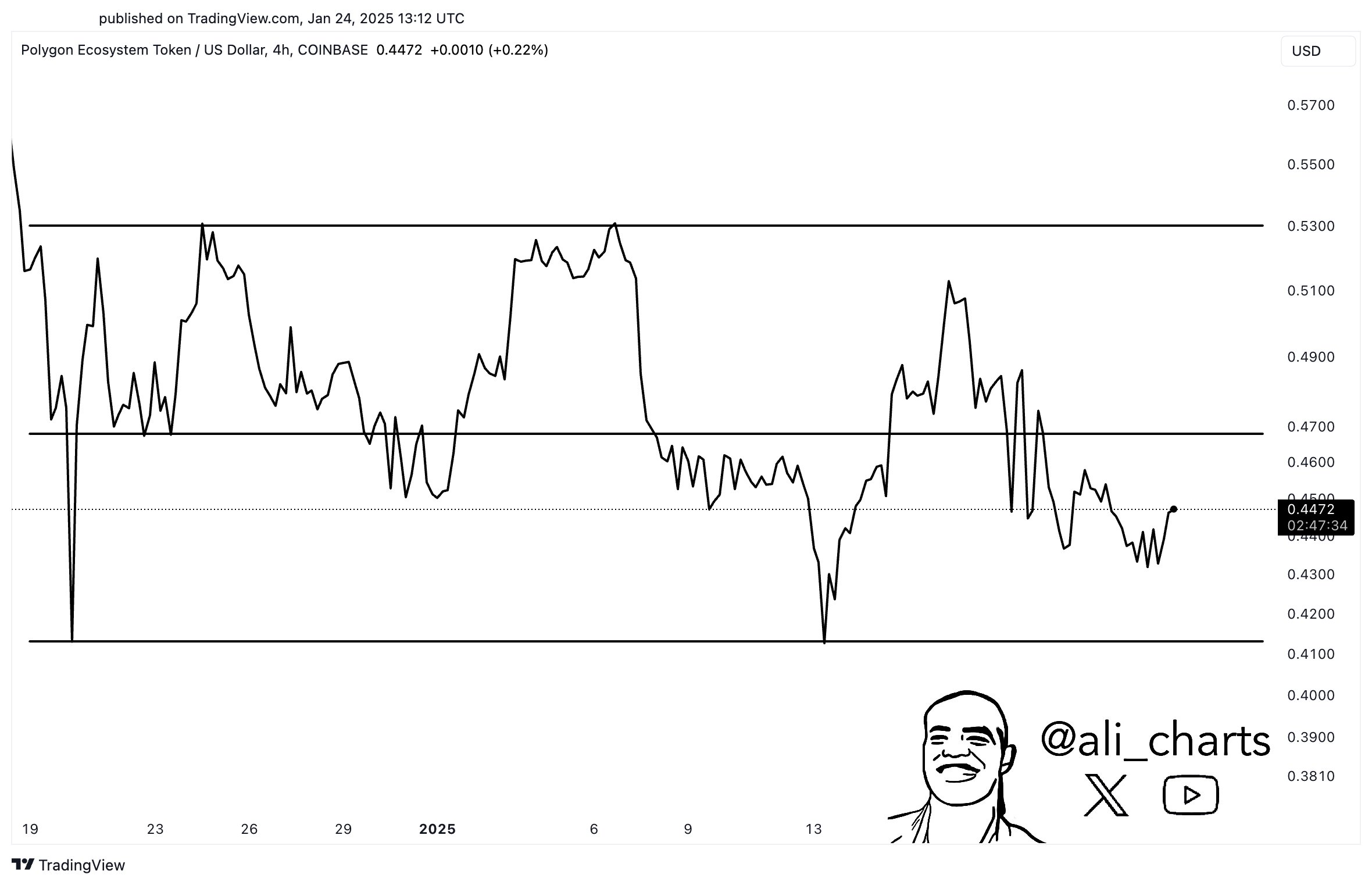 In a post on X, popular crypto analyst Ali Martinez pointed out that the POL utility token was trading within a range since December. This range extended from $0.414 to $0.531.