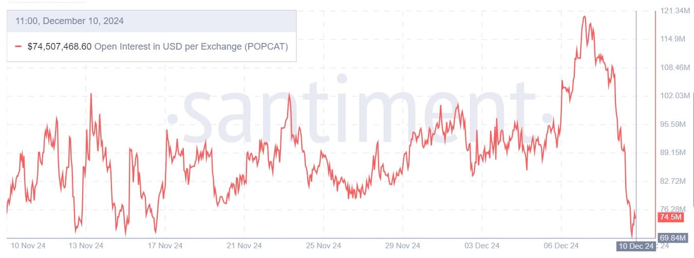 Additionally, Popcat’s Open Interest per Exchange has declined from $119.9 million to $74.5 million over the past three days.