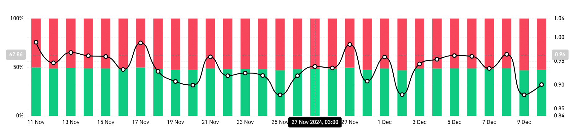 This phenomenon is further evidenced by the fact that most investors are taking short positions. According to the Long/Short Ratio, short investors are dominating the market with 52% of the total positions.