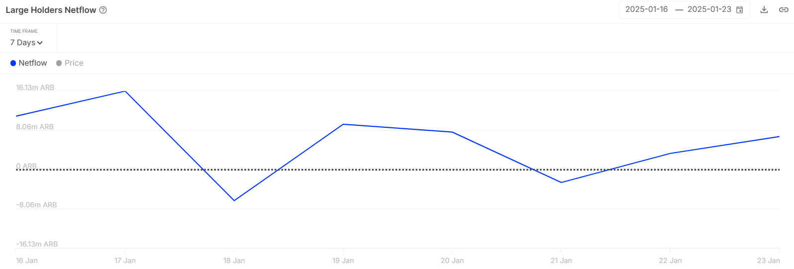 Arbitrum whales have increased their activity lately, after large transaction volumes climbed by 38% in 24 hours to 85.9M ARB. Much of this surge stems from whale accumulation, as depicted by rising large holder inflows.