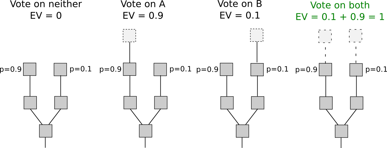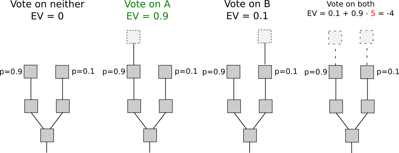 Another set of strategies, called “Slasher 2.0” (in contrast to Slasher 1.0, the original security deposit-based proof of stake algorithm), involves simply penalizing voters that vote on the wrong fork, not voters that double-vote. This makes analysis substantially simpler, as it removes the need to pre-select voters many blocks in advance to prevent probabilistic double-voting strategies, although it does have the cost that users may be unwilling to sign anything if there are two alternatives of a block at a given height. If we want to give users the option to sign in such circumstances, a variant of logarithmic scoring rules can be used (see here for more detailed investigation). For the purposes of this discussion, Slasher 1.0 and Slasher 2.0 have identical properties.