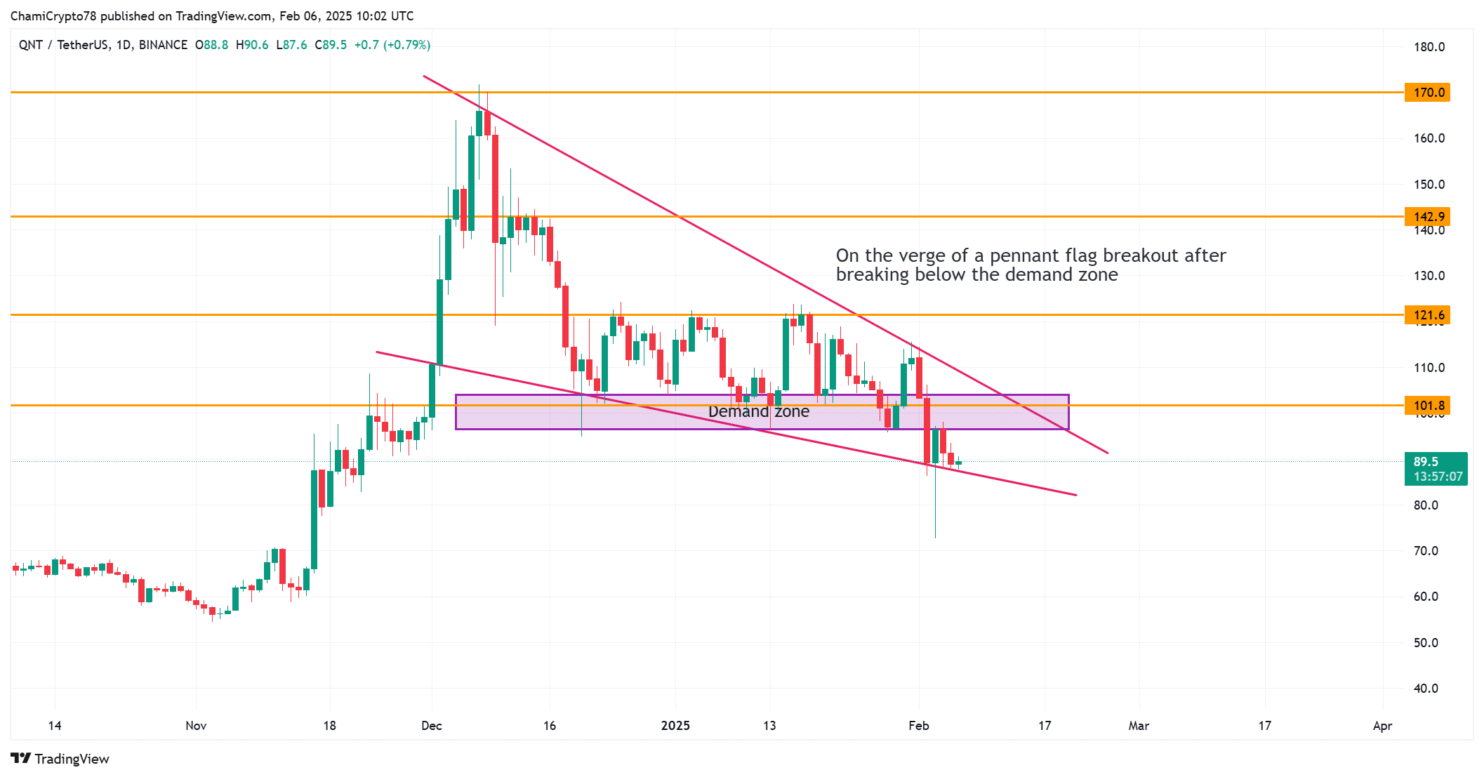 Quant’s price chart reveals a significant technical pattern. The asset has recently broken below its demand zone and is now testing key support around $89. If this support level fails to hold, the price may drop toward $72.65.