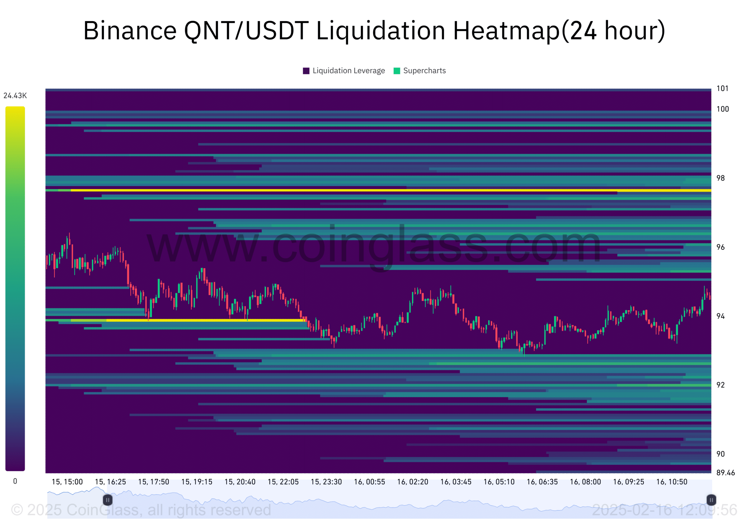 The Binance liquidation heatmap showed significant liquidation clusters between $96 and $98. If Quant moves into this zone, forced liquidations could trigger rapid price movement.