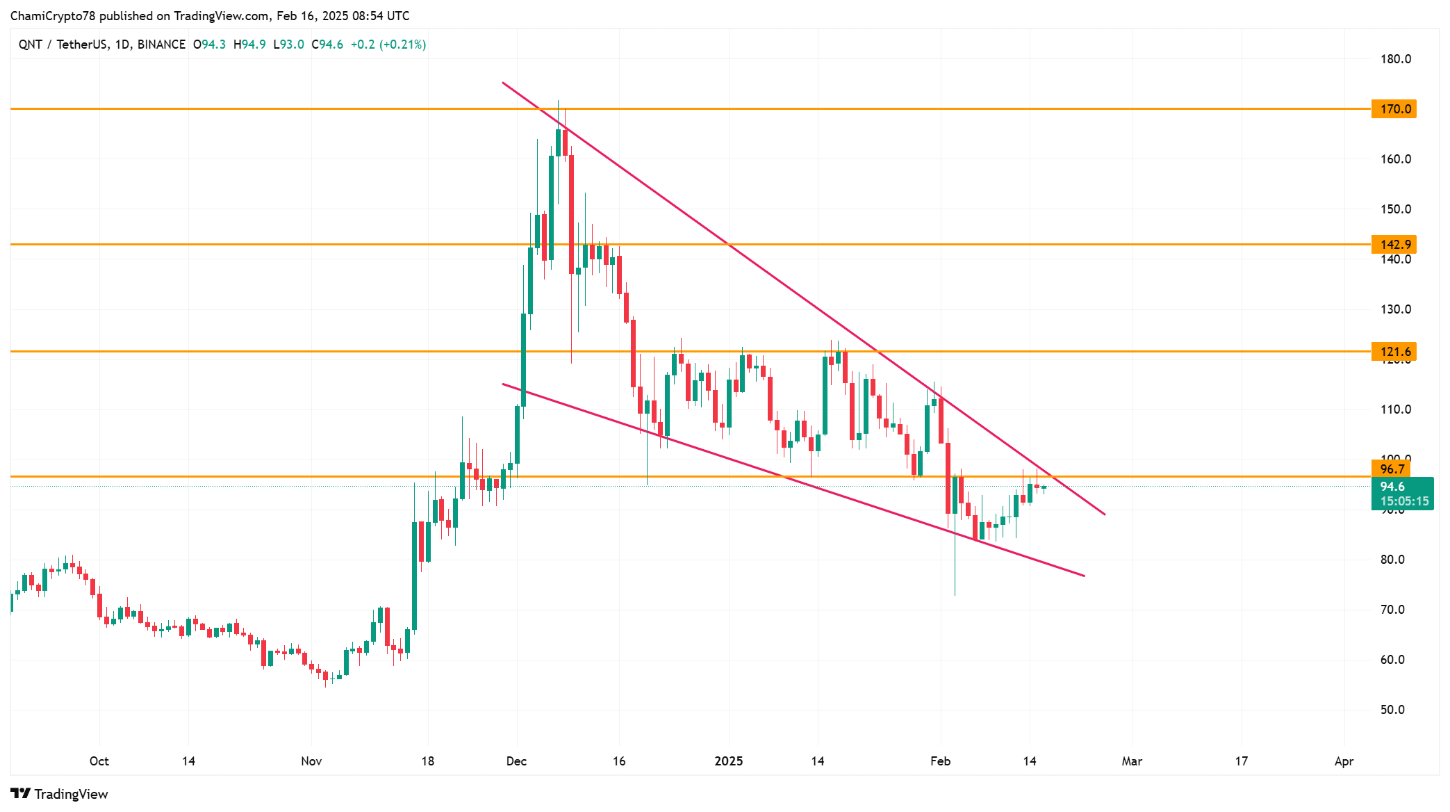 QNT has been moving inside a falling wedge, a bullish reversal pattern. The $96.80 resistance has repeatedly rejected price surges, making it a key level to watch.