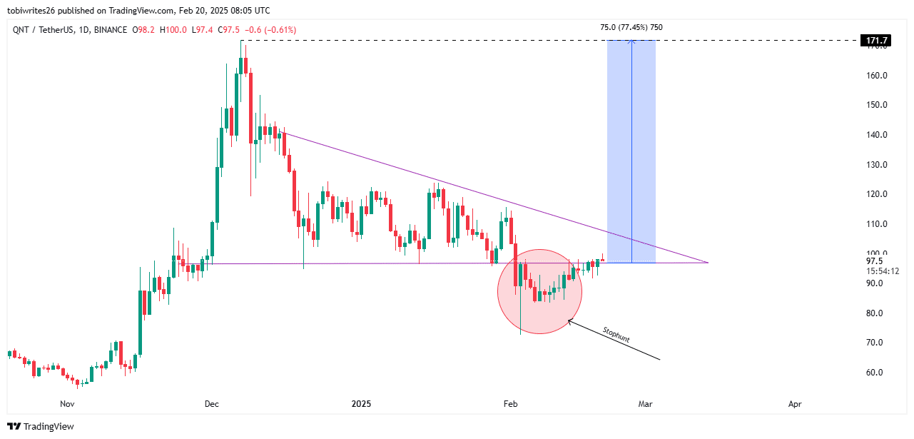 On the daily chart, QNT has been trading within a bullish triangle pattern, with prices trending within a defined range of support and resistance. Recently, QNT breached this pattern, forming a potential stop hunt.