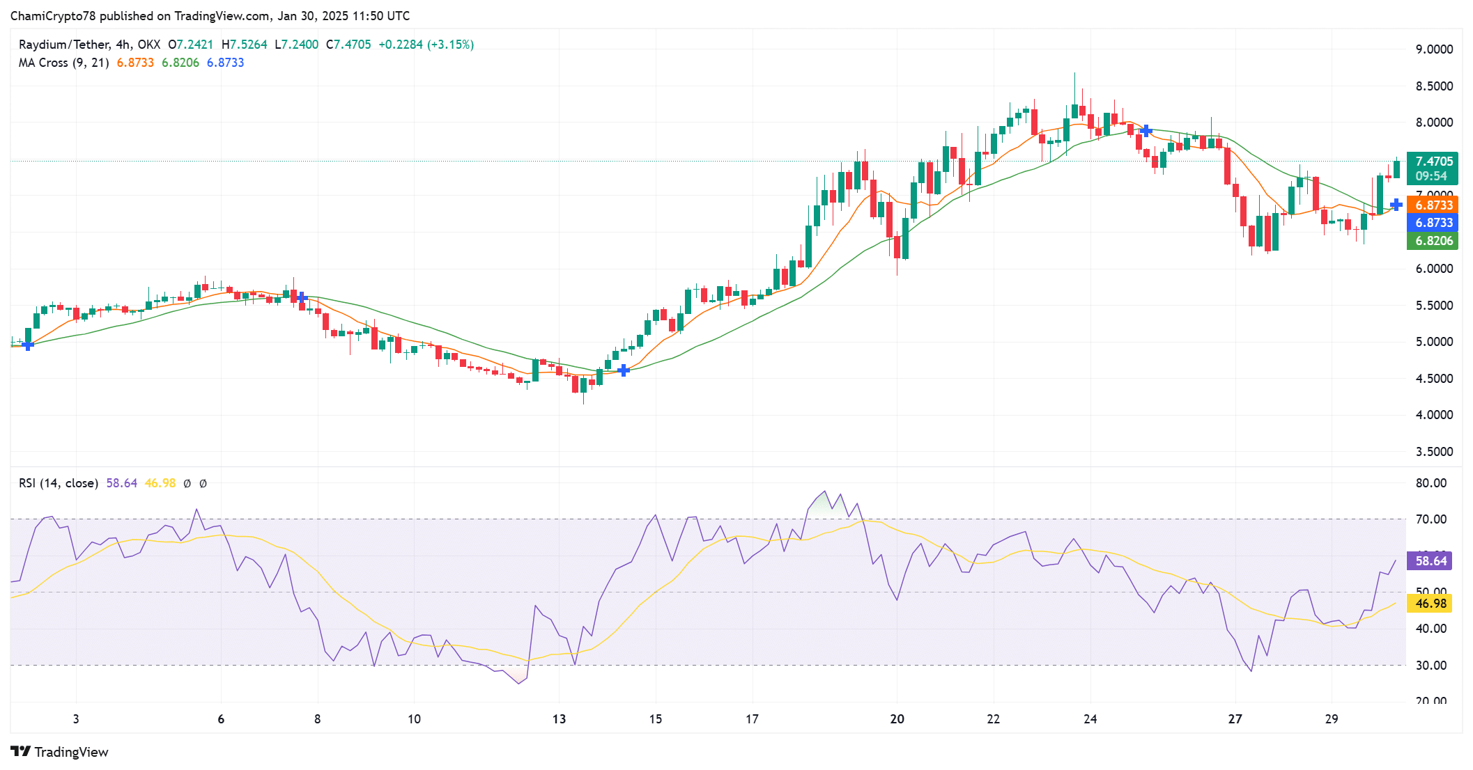 However, the $8 resistance level remains a key barrier that must be broken for further gains. Therefore, traders closely monitor whether RAY can sustain this uptrend or face a rejection.