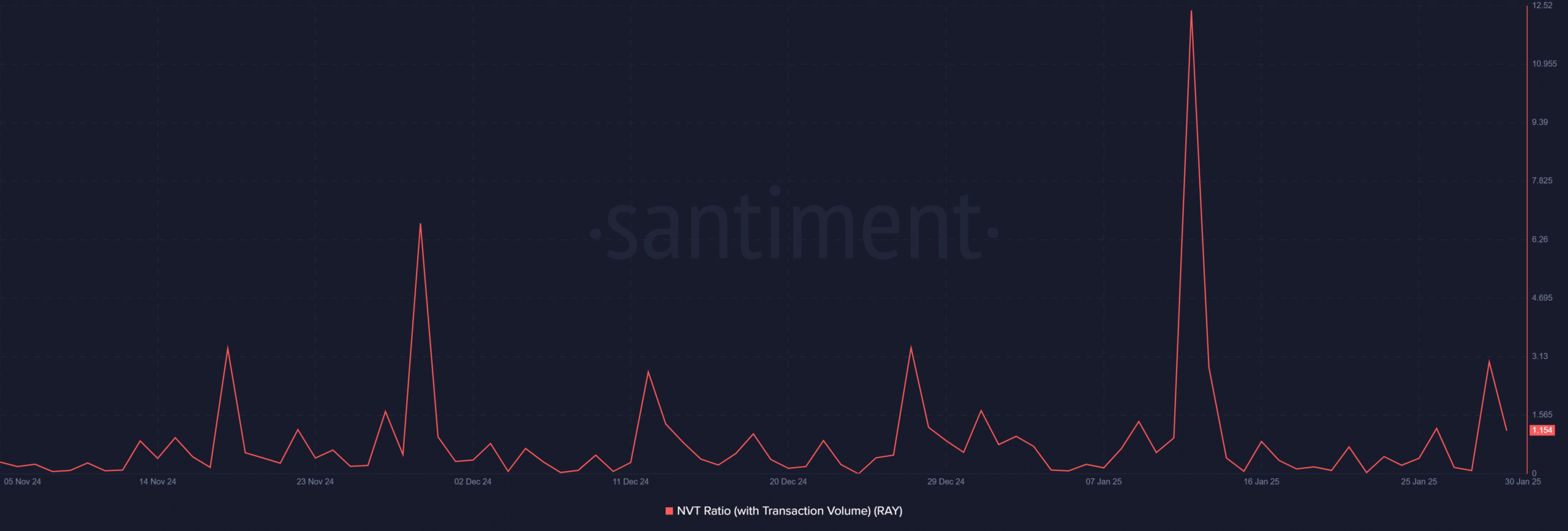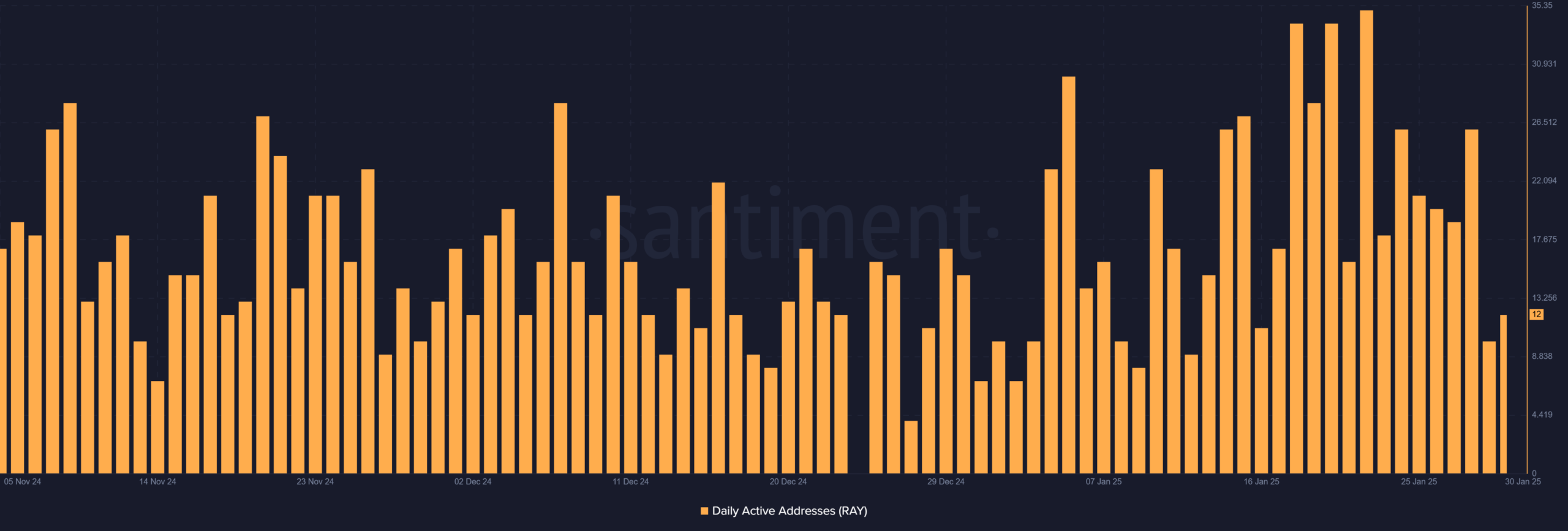 If this number continues rising, it could indicate stronger demand for RAY, supporting further price appreciation. However, any sudden drop in active addresses might suggest weakening interest.
