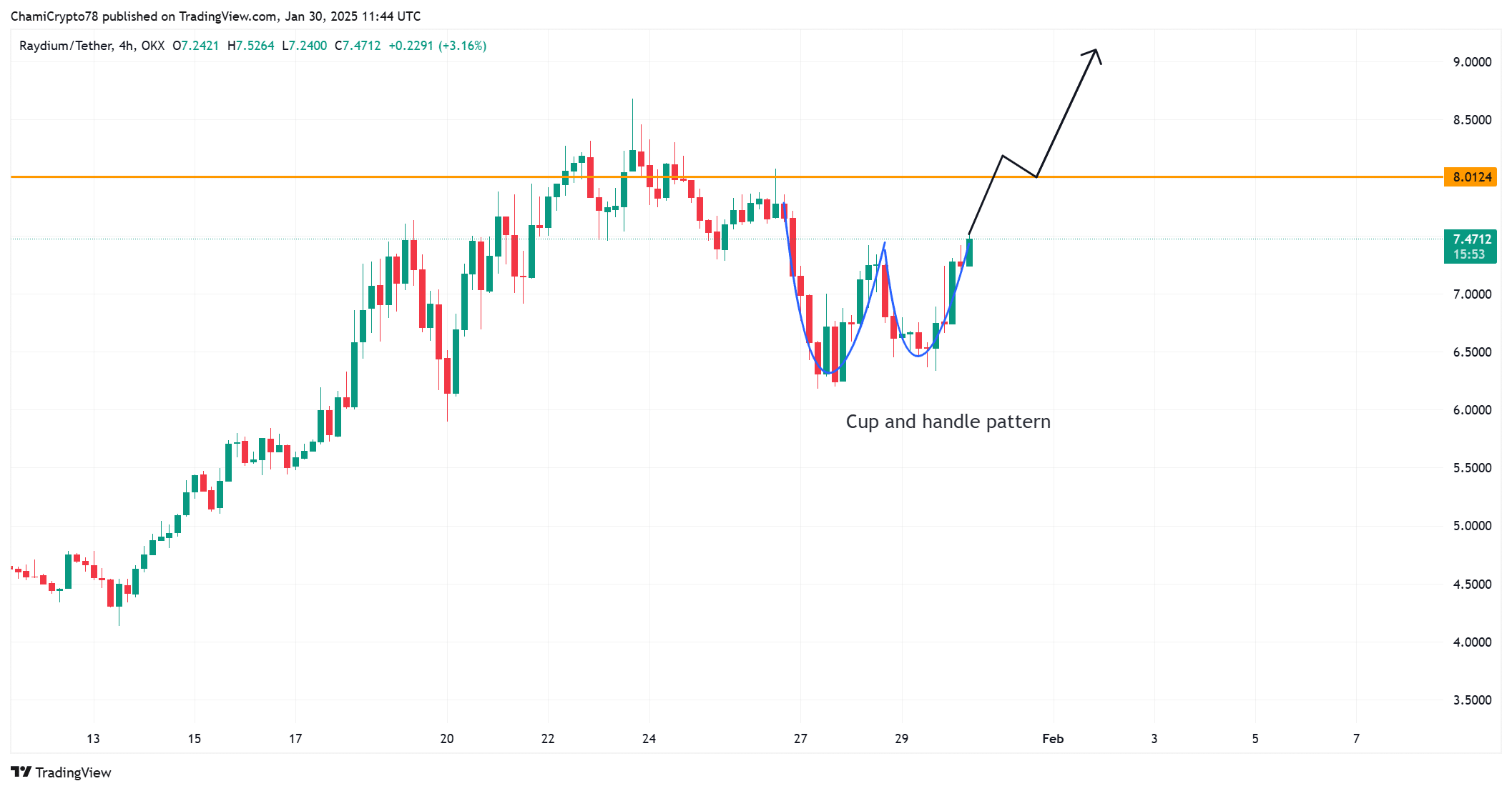 Raydium [RAY] has recorded an impressive 15% surge in the last 24 hours, pushing its price to $7.50, at press time. This bullish momentum follows a cup-and-handle pattern, signaling a potential breakout.