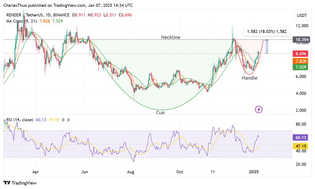 Render Token ($RENDER) has once again caught the eye of cryptocurrency analysts by forming a notable bullish chart pattern known as the cup and handle.
