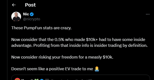 Critics have raised concerns about the platform’s trading environment. Data suggests that while some users profit significantly, over 60% incur losses. The CEO of Coin Bureau has hinted at possible insider advantages, describing Pump.Fun’s trading dynamics as “crazy.”