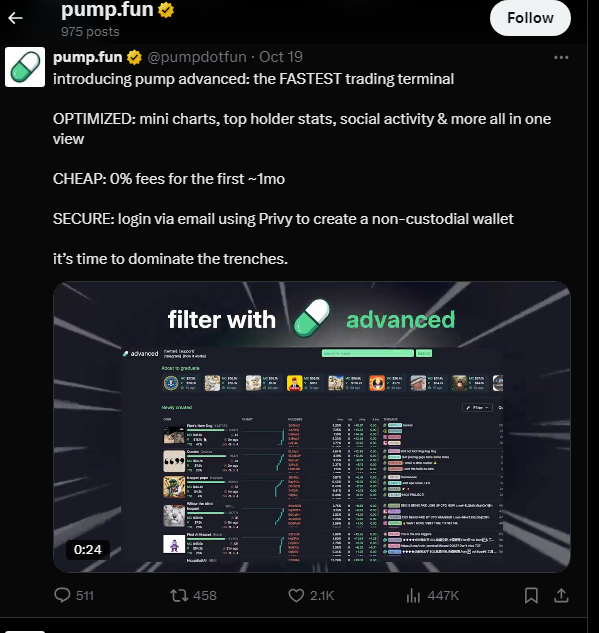 In October 2024, Pump.Fun unveiled its “fastest trading terminal,” which includes real-time mini-charts, top-holder statistics, and social activity tracking. These features aim to help users make more informed decisions. Additionally, the terminal offers an advanced filtering system for navigating memecoins and comes with 0% trading fees for its first 30 days, encouraging user adoption.