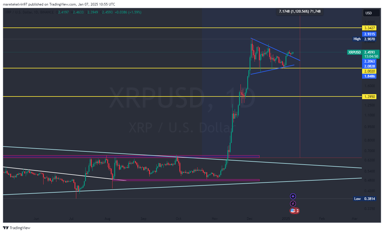 This signal comes at a time when XRP’s price recently bounced off a bullish pennant resistance, a pattern often associated with continued upward price movement.