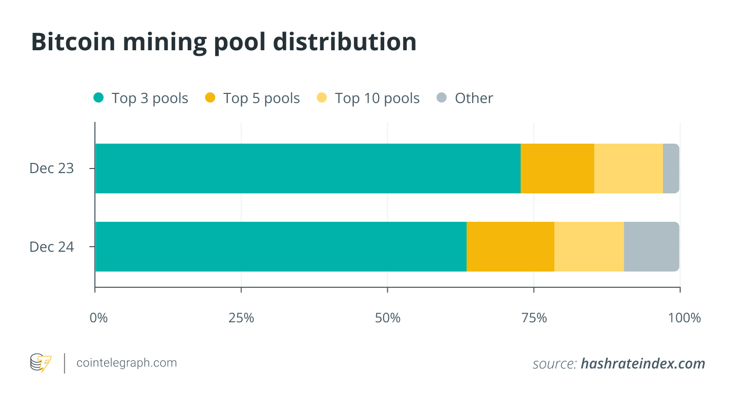 Also of note: mining pools are more evenly distributed. The top 10 mining pools still make up the lion’s share of hashrate, but their overall hashrate fell in 2024.