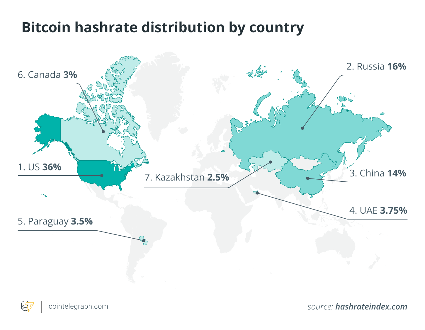The US and China’s share of global hashrate have declined. The two countries still lead the world in hashrate, but an analysis by country from Hash Rate Index — cited by River — shows that hashrate is spreading out.