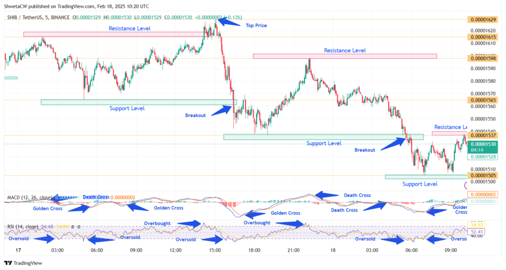 By 19:00 UTC, support was found at $0.00001537, but renewed overbought signals at 21:55 UTC and 22:10 UTC set a new resistance at $0.00001598. As February 18th began, SHIB maintained a downward trajectory, with a death cross on the MACD at 4:05 UTC reinforcing bearish pressure. An oversold RSI condition at 5:40 UTC preceded a breakout at 6:10 UTC, followed by another oversold instance, signaling uncertainty. A final oversold situation at 6:55 UTC led to a golden cross at 7:00 UTC, providing support at $0.00001505. This golden cross momentarily lifted the price to a resistance level of $0.00001538, but sustained bullish momentum remains uncertain.
