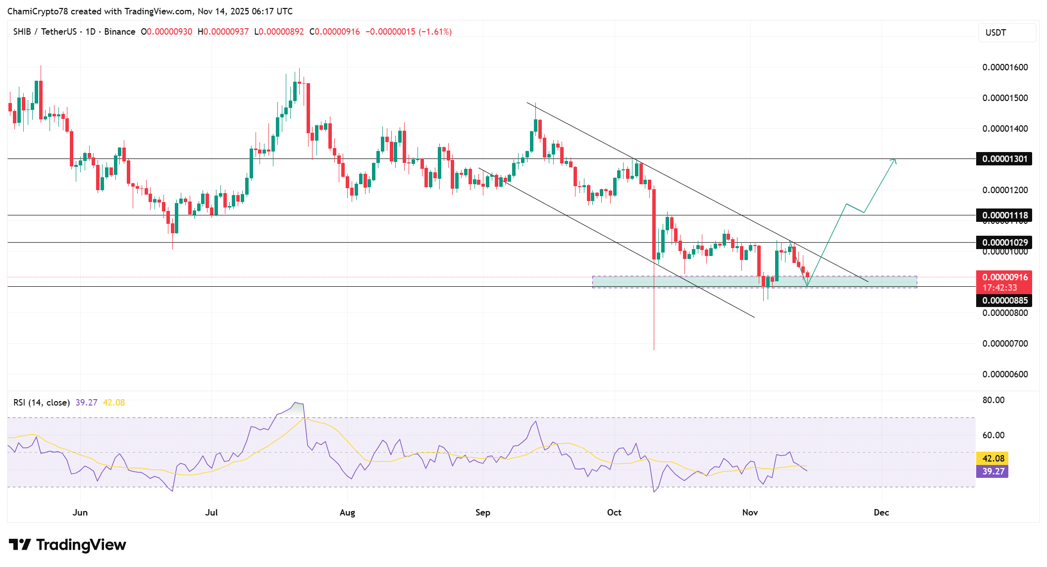 The chart also displays a clear breakout path toward 0.00001029, 0.00001118, and eventually 0.00001301, giving SHIB a clean set of targets if momentum follows through.