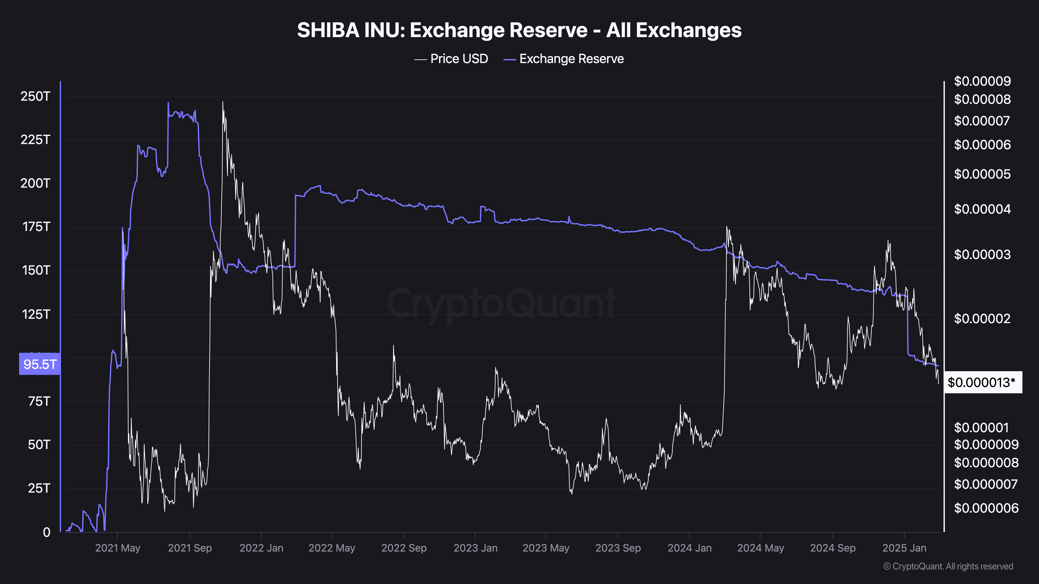 According to CryptoQuant data, SHIB’s Exchange Reserves have dropped to 95.5T, meaning fewer tokens are available for sale on exchanges.
